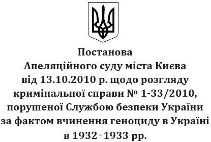 Суддя судової палати у кримінальних справах Апеляційного суду міста Києва Скавронік В.М., при секретареві Бондаренко М.С., за участю прокурора відділу прокуратури міста Києва Доценко О. М. здійснив попередній розгляд кримінальної справи №1-33/2010, порушеної Службою безпеки України за фактом вчинення геноциду в Україні в 1932–1933 роках за ознаками злочину, передбаченого ч.1 ст. 442 КК України, відносно